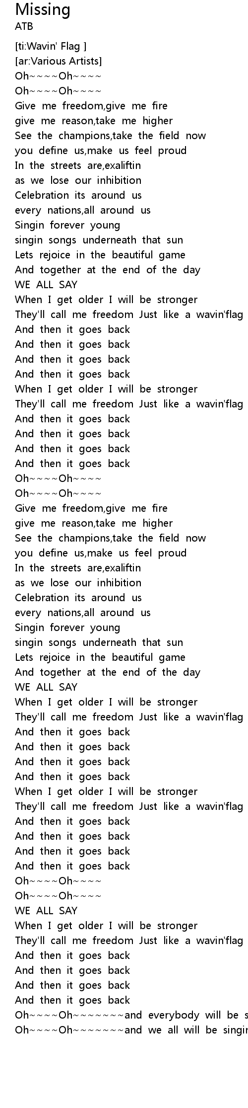 [02:57.00] They'll call me freedom Just like a wavin'flag