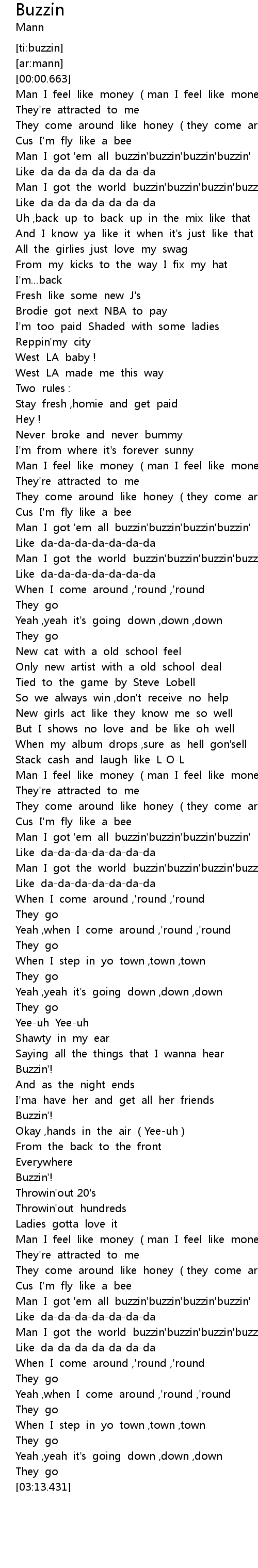 | [02:51.956] | Man I got the world buzzin' buzzin' buzzin' buzzin' |
