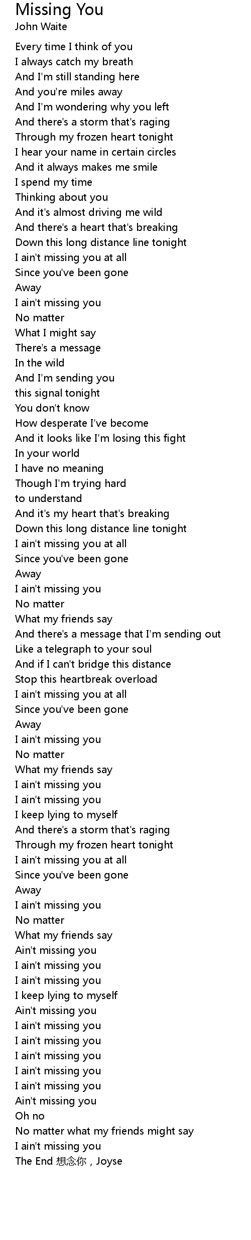| [01:11.540] | I ain't missing you at all |