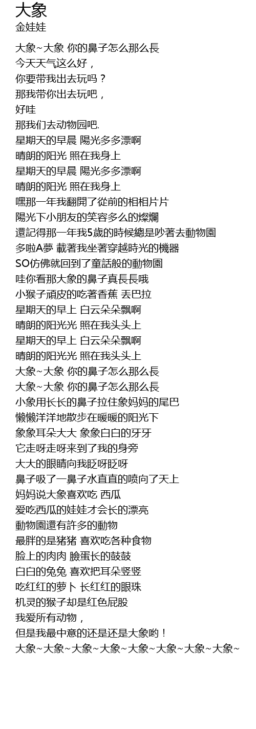 | [01:03.520] | 大象~大象 你的鼻子怎么那么長 |