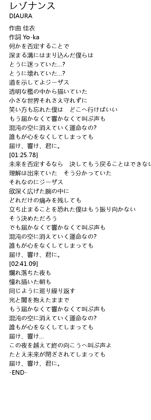 | [03:31.77] | この夜を越えて終の向こうへ叫ぶ声よ |
