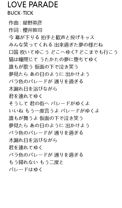 | [02:13.257] | いいね もう一度言うよ パレードがゆくよ |