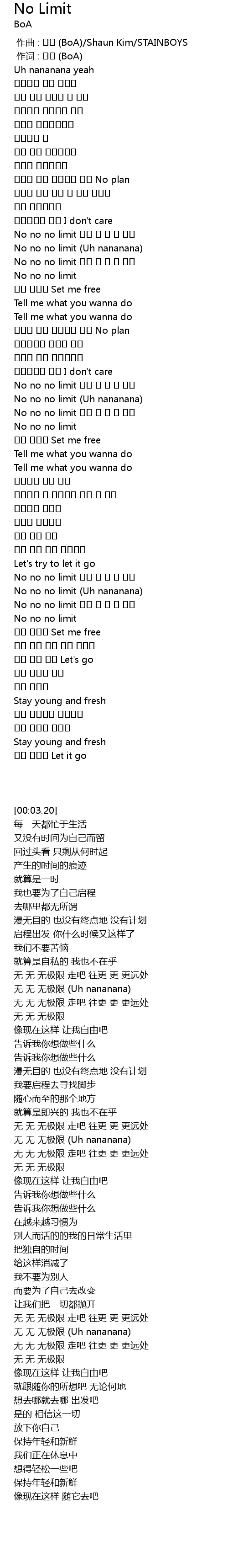 | [00:57.20] | No no no limit 가자 더 더 더 멀리 |