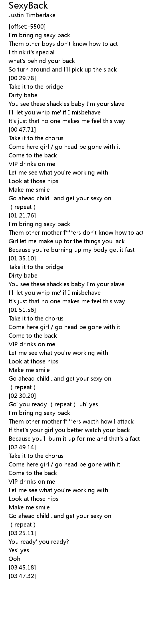 | [00:16.50] | I'm bringing sexy back |
