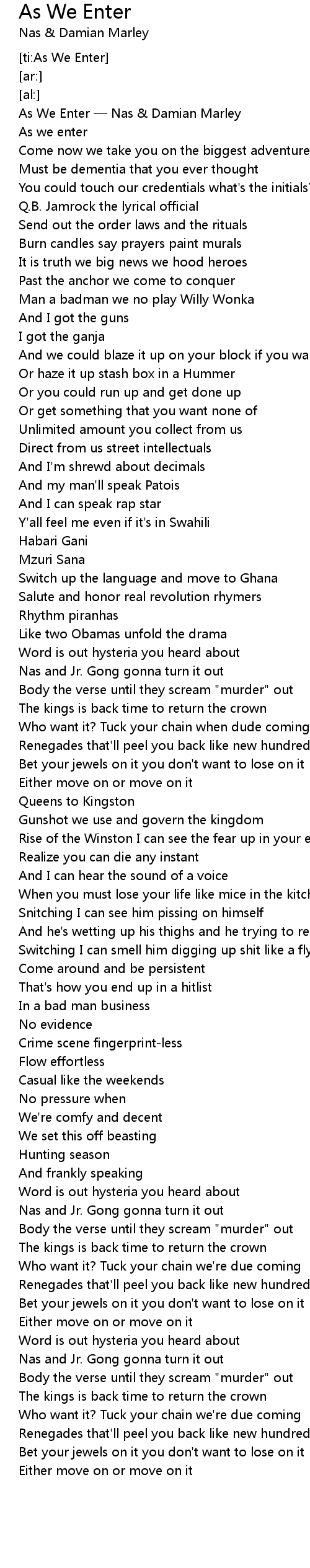| [00:00.66] | As We Enter — Nas & Damian Marley |