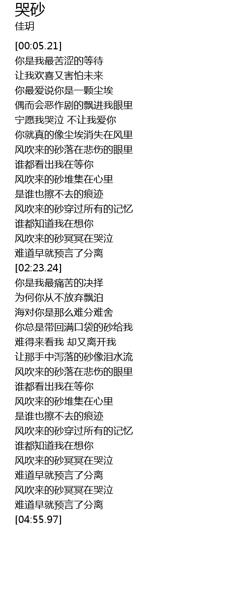 | [01:24.22] | 风吹来的砂落在悲伤的眼里 |