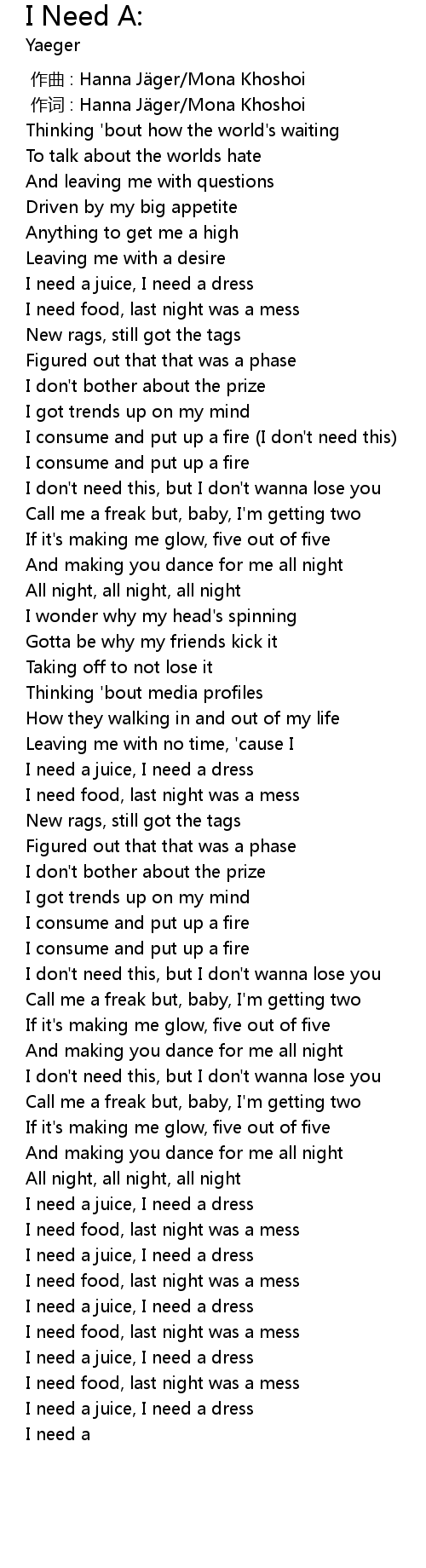 | [02:56.67] | I need a juice, I need a dress |