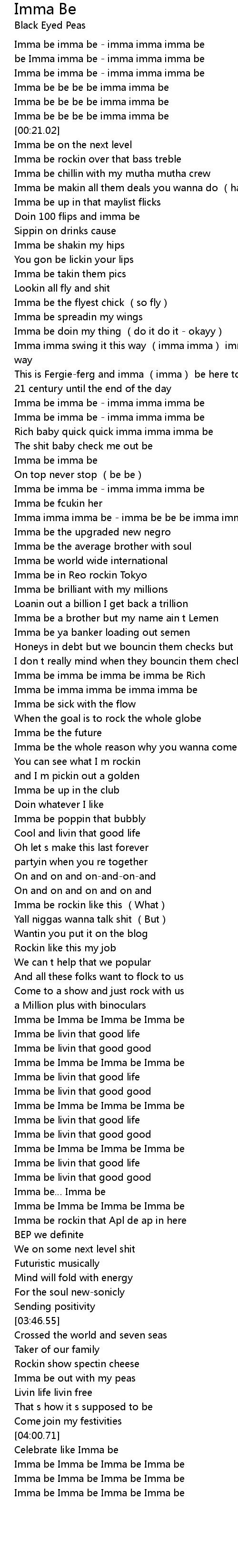 | [03:24.55] | Imma be Imma be Imma be Imma be |