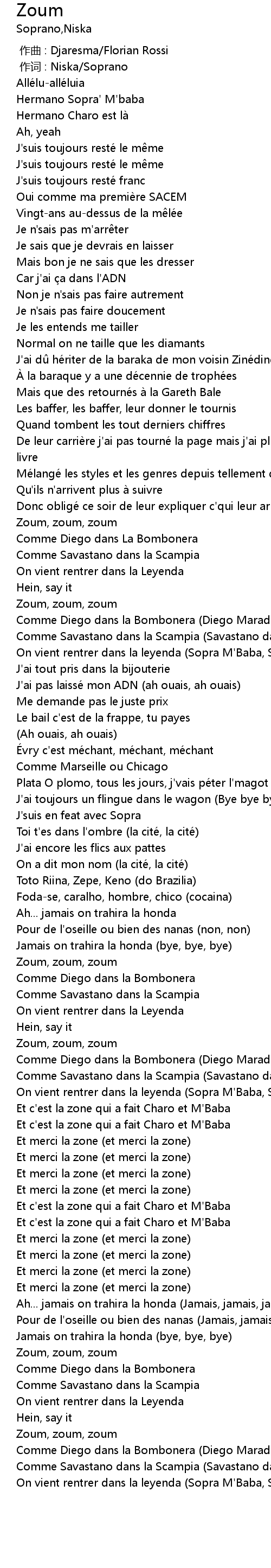 | [02:32.45] | On vient rentrer dans la leyenda (Sopra M'Baba, Sopra champion) |