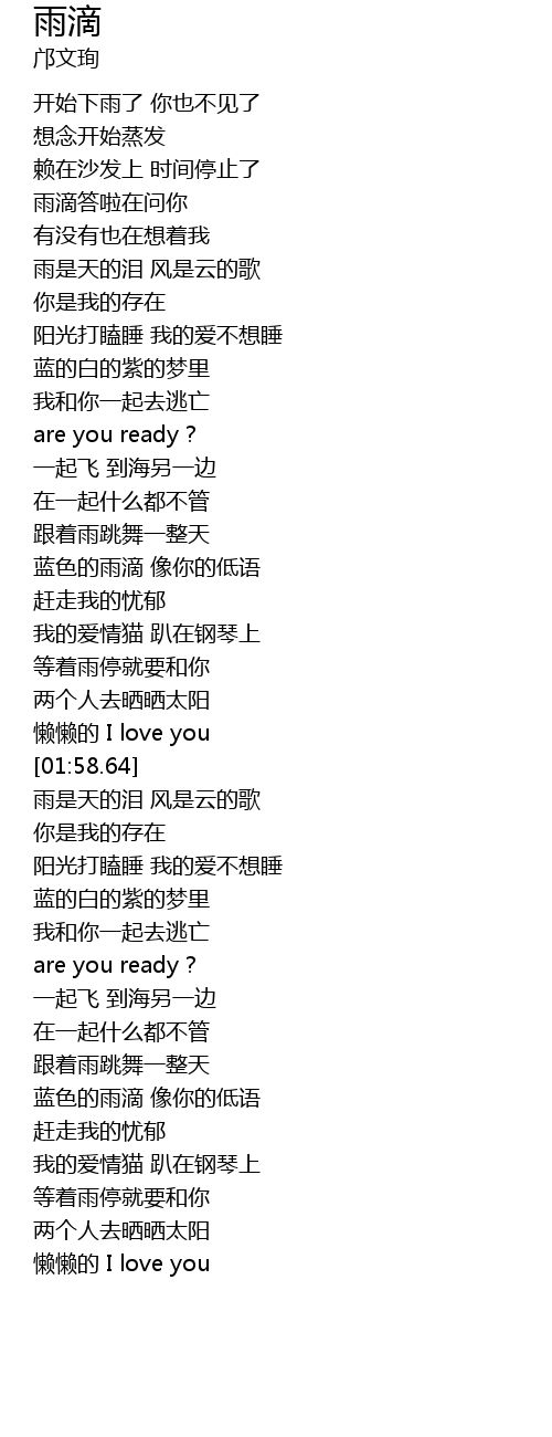 | [01:30.45] | děng zhe yǔ tíng jiù yào hé nǐ |