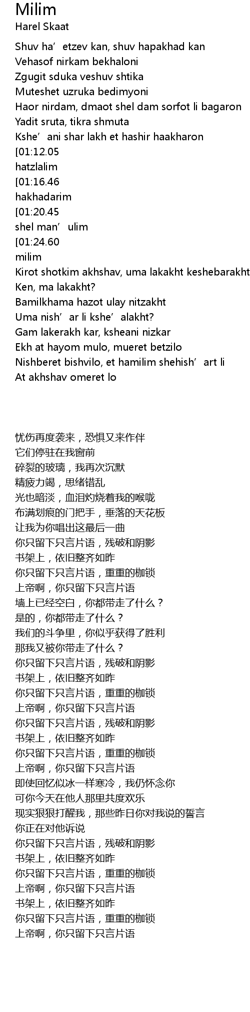 | [00:38.38][01:12.05][01:28.72][02:17.42] | Hish’art li rak milim, miklat bein hatzlalim |