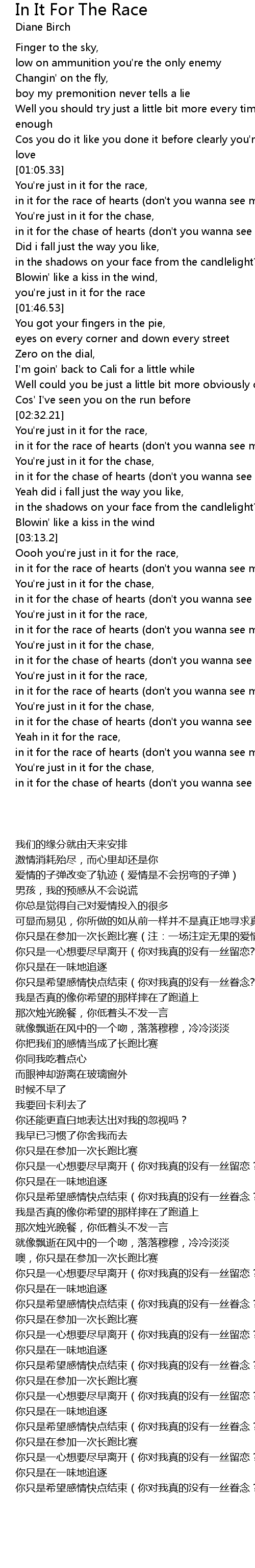 [01:06.23] 你只是在参加一次长跑比赛(注:一场注定无果的爱情,就像一场长跑比赛,无论谁到了终点,爱情都以失败告终)
