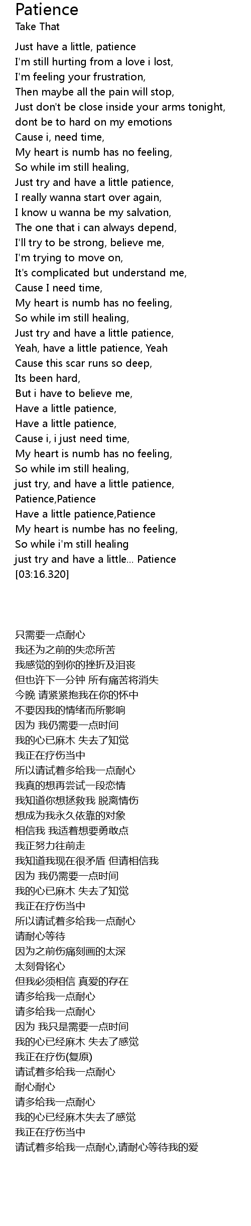 | [03:05.390] | 请试着多给我一点耐心,请耐心等待我的爱 |
