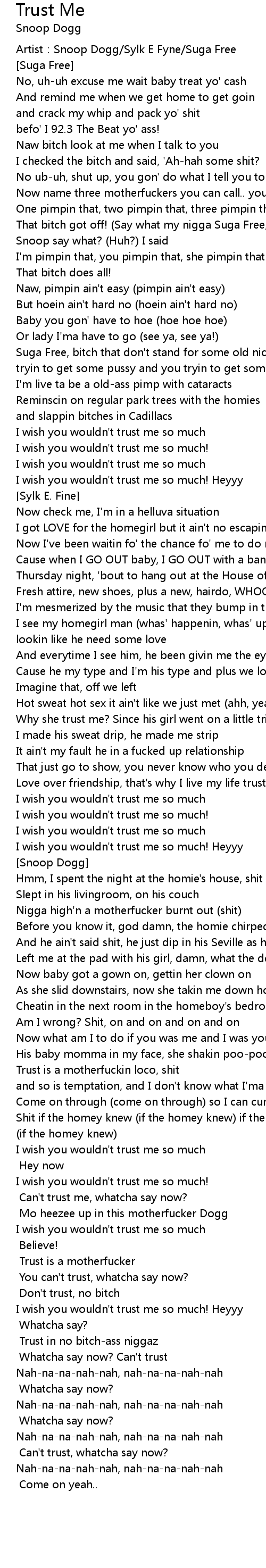 | [Snoop] Trust is a motherfucker | |