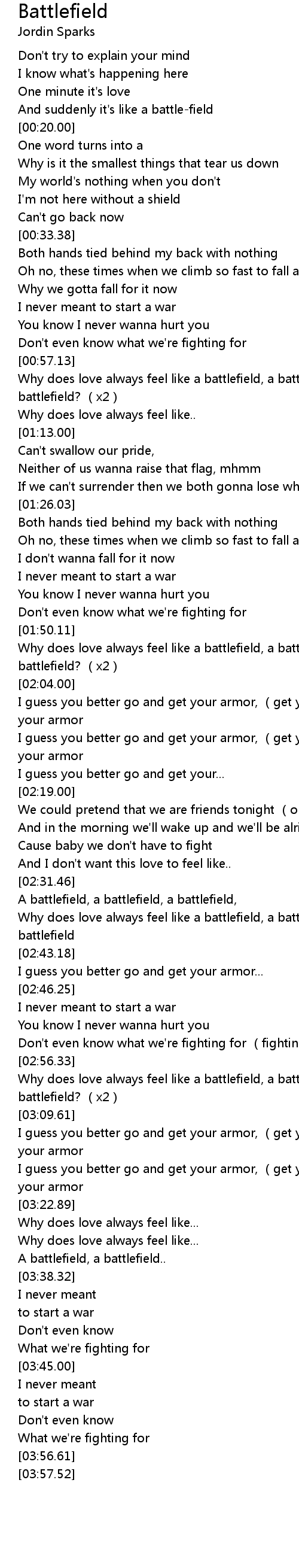 | [02:57.33] | Why does love always feel like a battlefield, a battlefield, a battlefield? x2 |