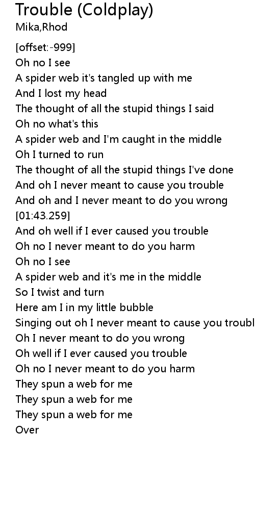 | [02:34.450] | Singing out oh I never meant to cause you trouble |