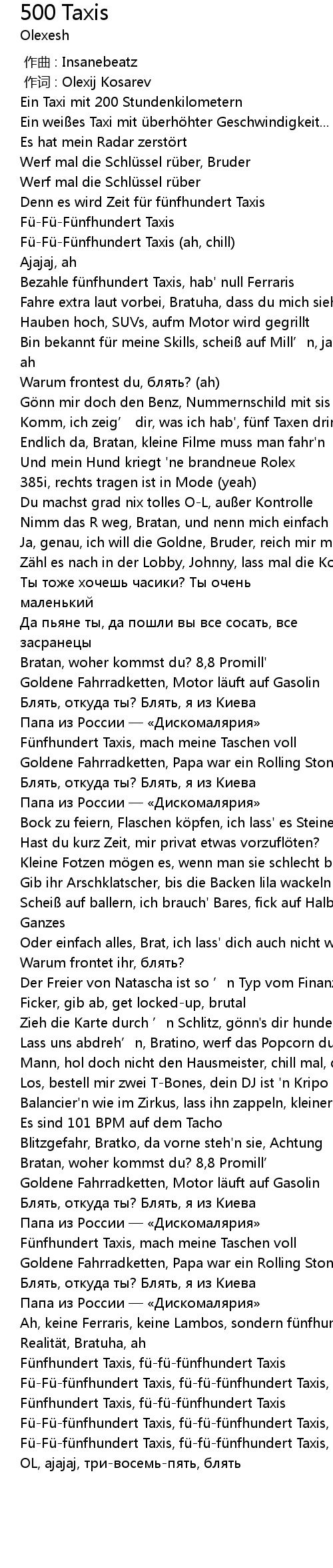 | [00:16.54] | Fü-Fü-Fünfhundert Taxis (ah, chill) |