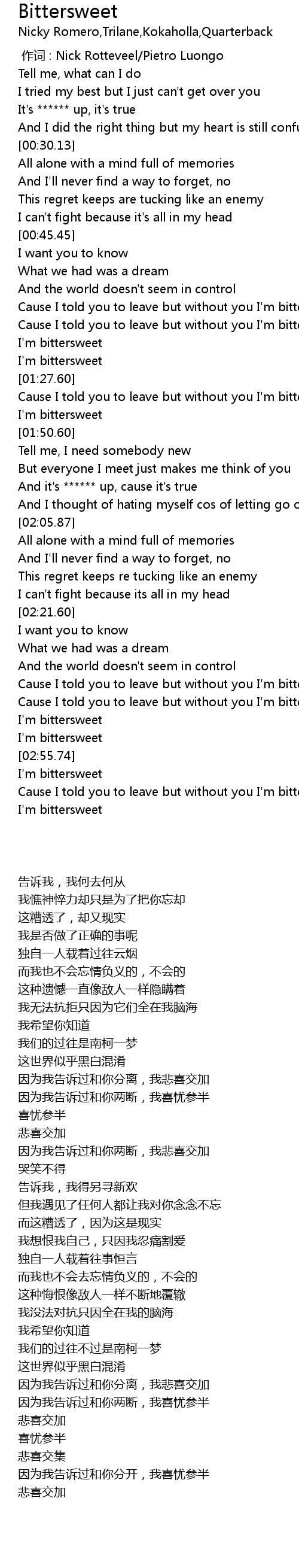 | [00:57.94] | Cause I told you to leave but without you I'm bittersweet |