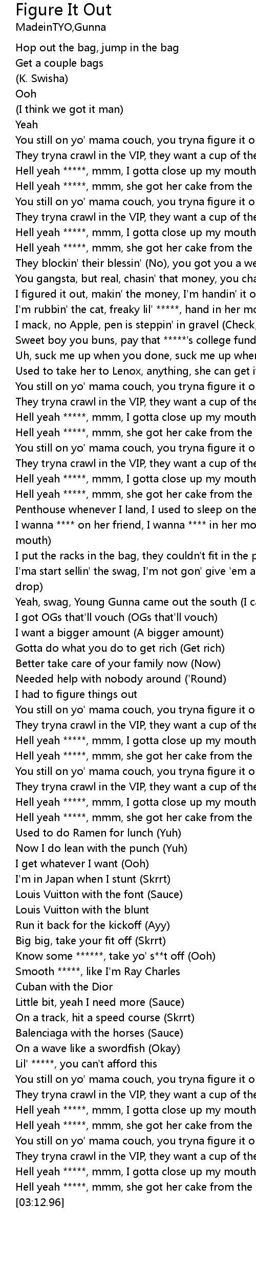 | [03:00.26] | You still on yo' mama couch, you tryna figure it out (Get up) |