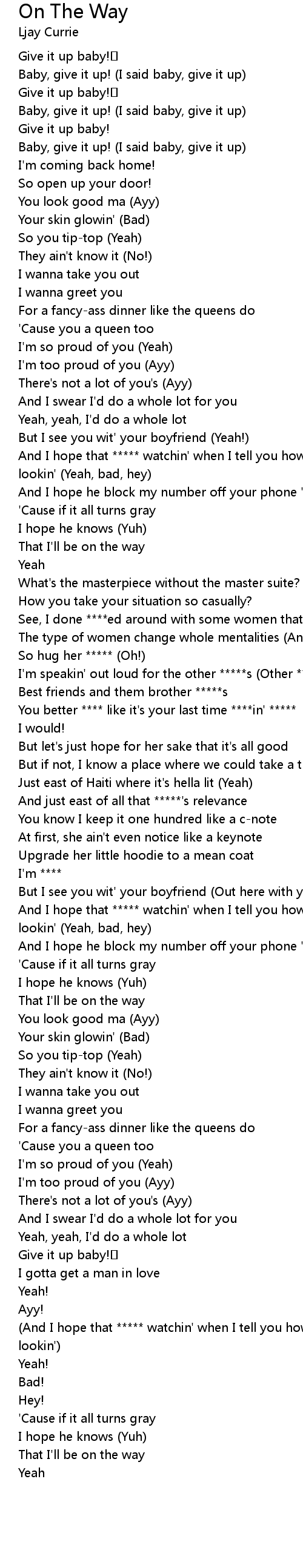 | [01:36.84] | And I hope that ***** watchin' when I tell you how good you been lookin' (Yeah, bad, hey) |
