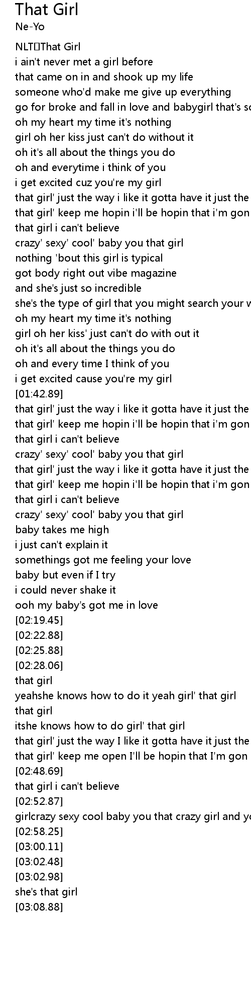 | [01:01.21] | crazy' sexy' cool' baby you that girl |