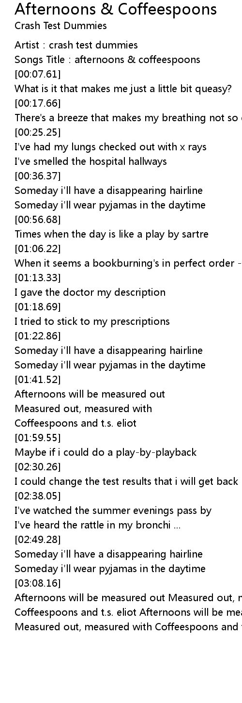 | [03:20.20] | Coffeespoons and t.s. eliot Afternoons will be measured out |