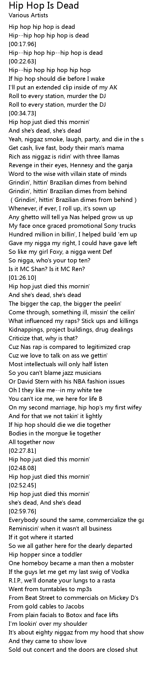 | [00:19.01] | Hip--hip hop hip--hip hop is dead |