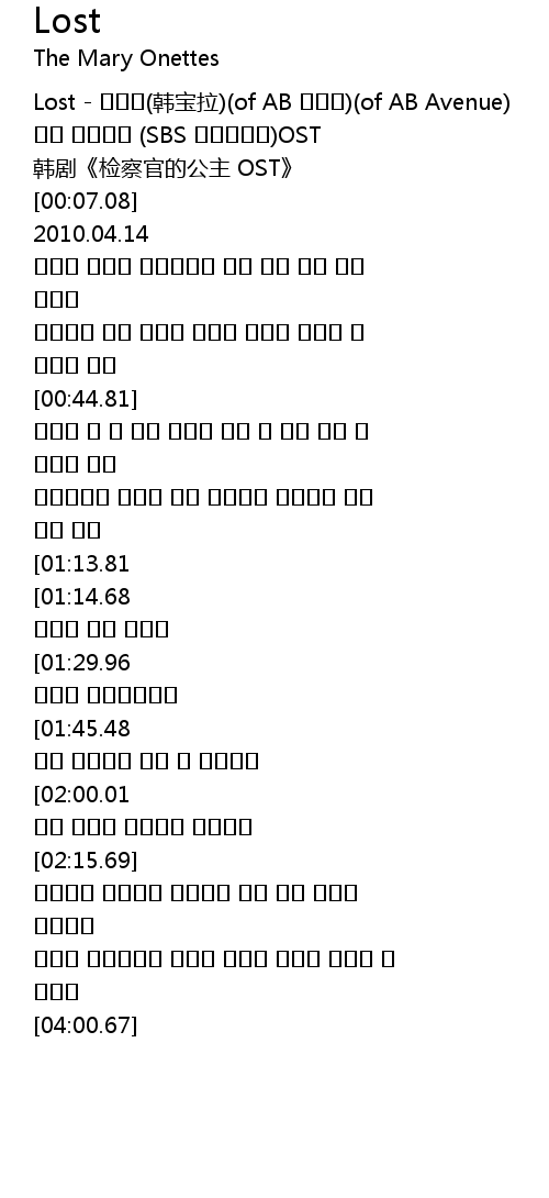 | [00:01.37] | Lost - 한보라(韩宝拉)(of AB 에비뉴)(of AB Avenue) |