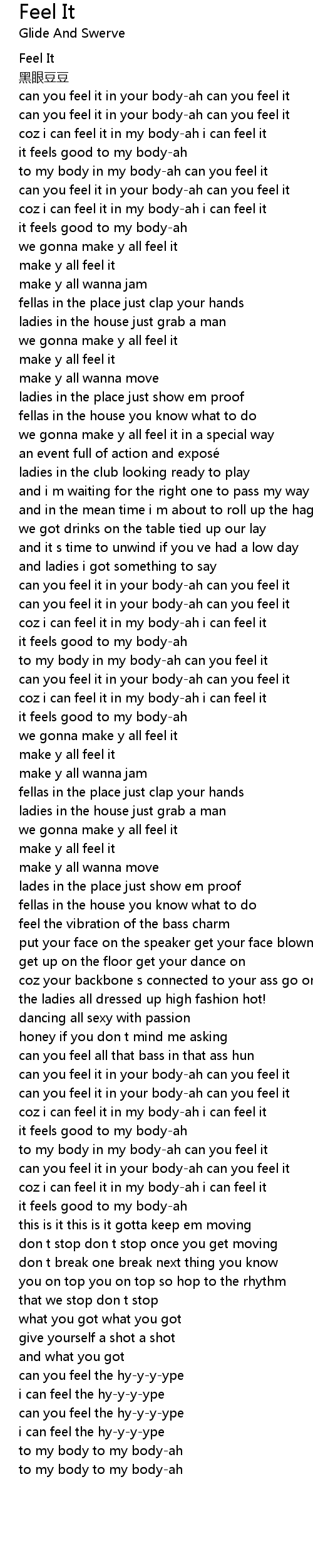 | [00:25.20] | to my body in my bodyah can you feel it |