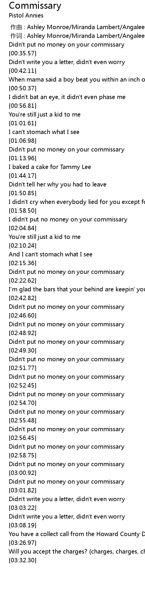 | [00:01.000] | zuò cí : Ashley Monroe Miranda Lambert Angaleena Presley |