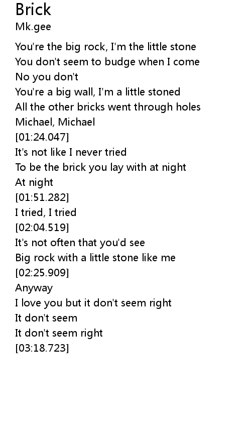| [00:18.779] | You're the big rock, I'm the little stone |