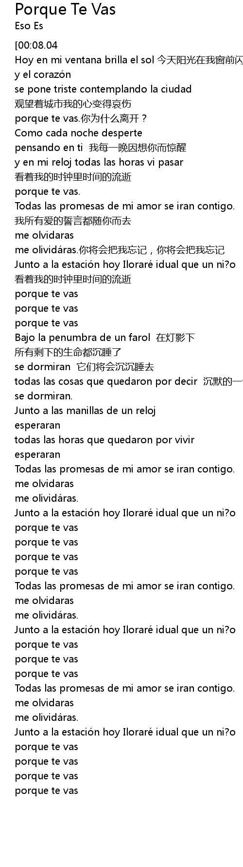 | [00:56.08] | Junto a la estació n hoy Iloraré idual que un ni? o kàn zhe wǒ de shí zhōng lǐ shí jiān de liú shì |