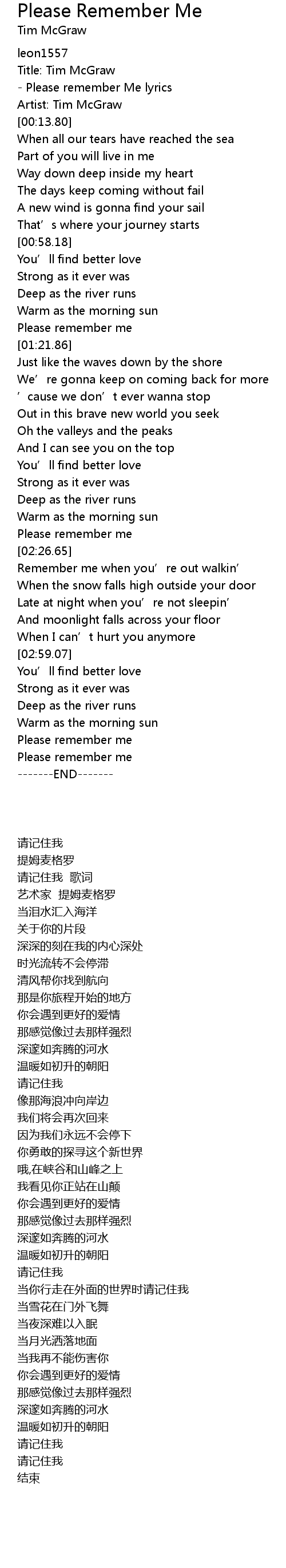 | [02:29.23] | 当你行走在外面的世界时请记住我 |