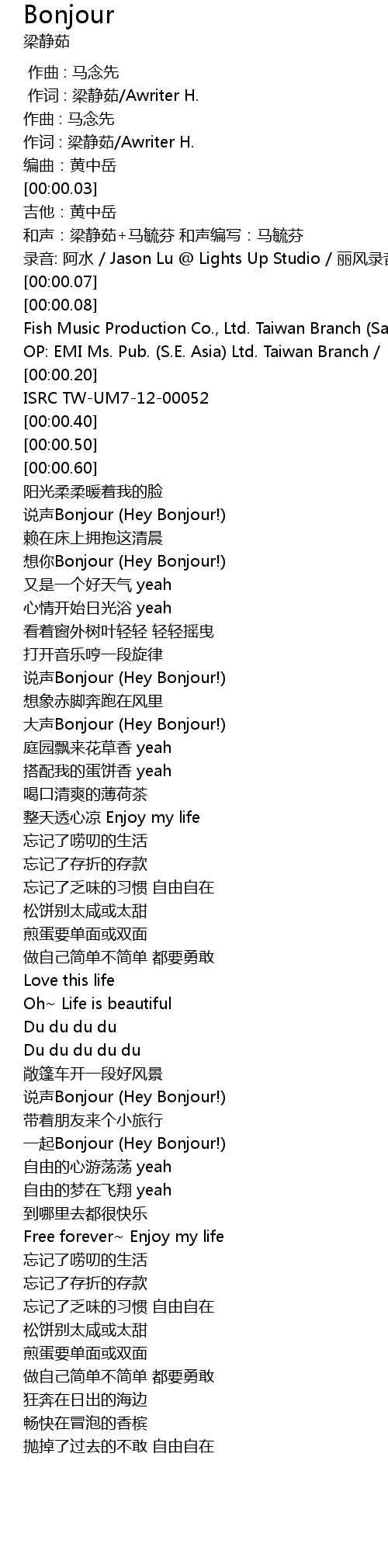 | [00:59.25] | shuo sheng Bonjour Hey Bonjour! |