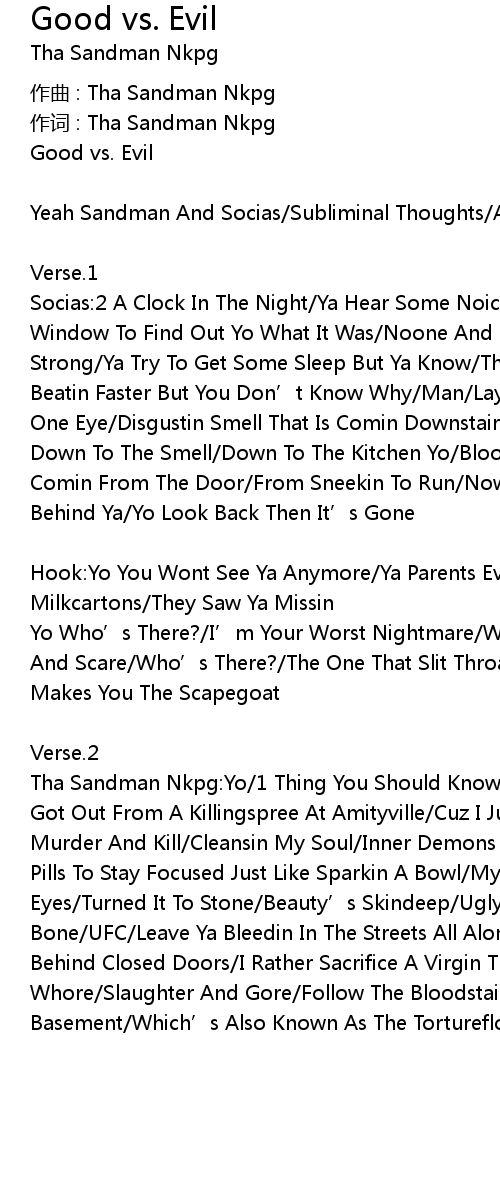 | Tha Sandman Nkpg:Yo/1 Thing You Should Know Is That I’m Mentally Ill/I Just Got Out From A Killingspree At Amityville/Cuz I Just Had To Purge/You Know Murder And Kill/Cleansin My Soul/Inner Demons Tried To Swallow Me Whole/Poppin Pills To Stay Focused Just Like Sparkin A Bowl/My Heart’s Been Hit By Medusas Eyes/Turned It To Stone/Beauty’s Skindeep/Ugly Goes Straight To The Bone/UFC/Leave Ya Bleedin In The Streets All Alone/If Ya Only Knew What Goes On Behind Closed Doors/I Rather Sacrifice A Virgin Than Give Cash To A Whore/Slaughter And Gore/Follow The Bloodstains On The Floor/Down To The Basement/Which’s Also Known As The Torturefloor |