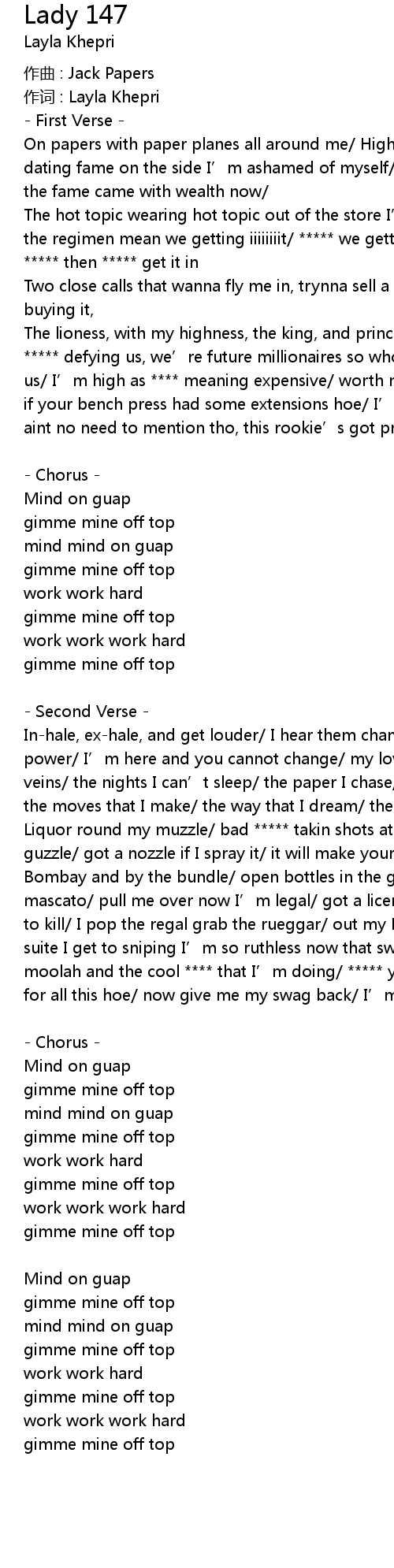 | Liquor round my muzzle bad takin shots at fools like bottles not to guzzle got a nozzle if I spray it it will make your the struggle got Bombay and by the bundle open bottles in the glove box in the trunk skunk and mascato pull me over now I' m legal got a license and it' s lethal that' s to kill I pop the regal grab the rueggar out my Ronald Reagan presidential suite I get to sniping I' m so ruthless now that swipers after me cuz all my moolah and the cool that I' m doing you cannot have that I worked for all this hoe now give me my swag back I' m too complex to be simple | |