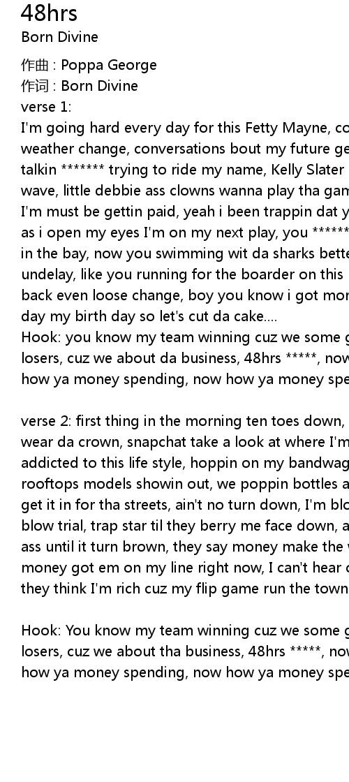 | Hook: you know my team winning cuz we some go gettas, and we don' t wit losers, cuz we about da business, 48hrs , now how ya money spending, now how ya money spending, now how ya money spending 2X | |