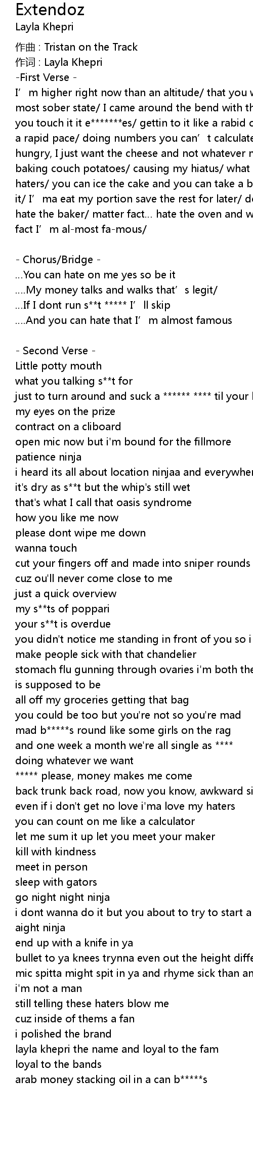| I' m higher right now than an altitude that you wouldn' t even know at your most sober state I came around the bend with that latitude got a barrel when you touch it it e es gettin to it like a rabid case kill the beat and at a rapid pace doing numbers you can' t calculate you a fowl snake I' m money hungry, I just want the cheese and not whatever mouse that ate it got an oven baking couch potatoes causing my hiatus what I miss the most is saying hi to haters you can ice the cake and you can take a bite but you don' t get to take it I' ma eat my portion save the rest for later don' t hate the cake hate the baker matter fact hate the oven and while you' re at it hate the fact I' m almost famous | |