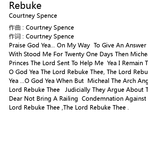 | Praise God Yea... On My Way To Give An Answer Of The Lord The Prince Persia With Stood Me For Twenty One Days Then Micheal One Of The Chief Celestial Princes The Lord Sent To Help Me Yea I Remain Their With The Kings Of Persia O God Yea The Lord Rebuke Thee, The Lord Rebuke , Thee The Lord Rebuke Thee, O Yea ... O God Yea When But Micheal The Arch Angel Contended With The Devil, The Lord Rebuke Thee Judicially They Argue About The Body Of Moses O God Yea You Dear Not Bring A Railing Condemnation Against Him The Lord Rebuke Thee , The Lord Rebuke Thee , The Lord Rebuke Thee . |