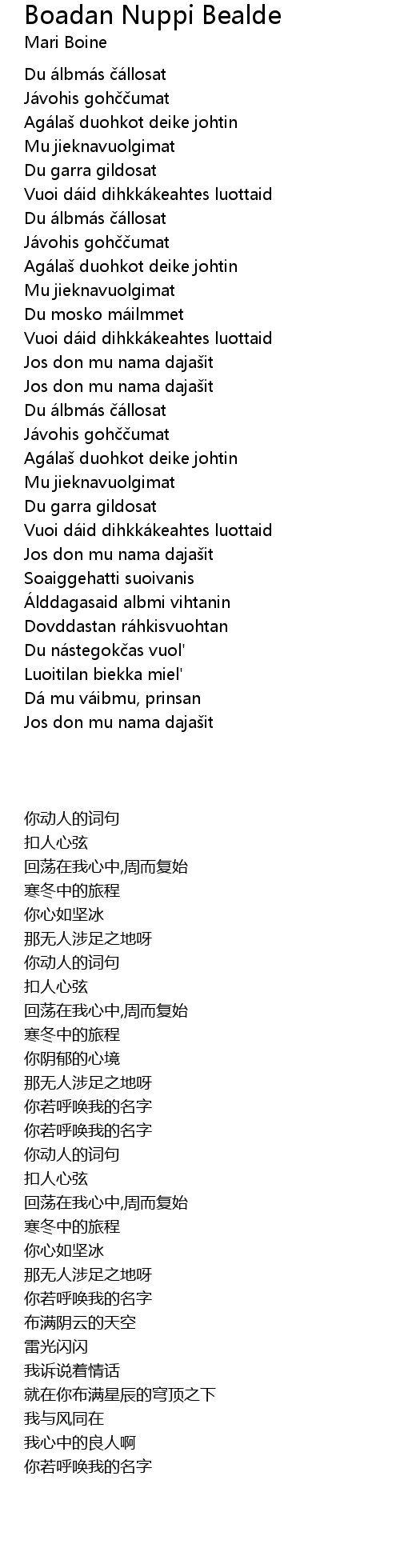 | 歌曲 | Boadan Nuppi Bealde |