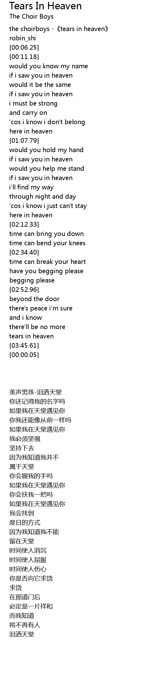 | [00:02.25] | the choirboys tears in heaven |