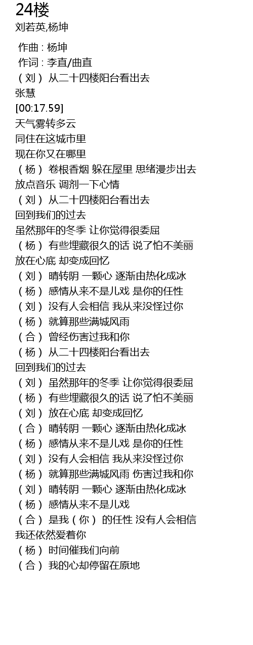 | [00:15.60] | liú cóng èr shí sì lóu yáng tái kàn chū qù |