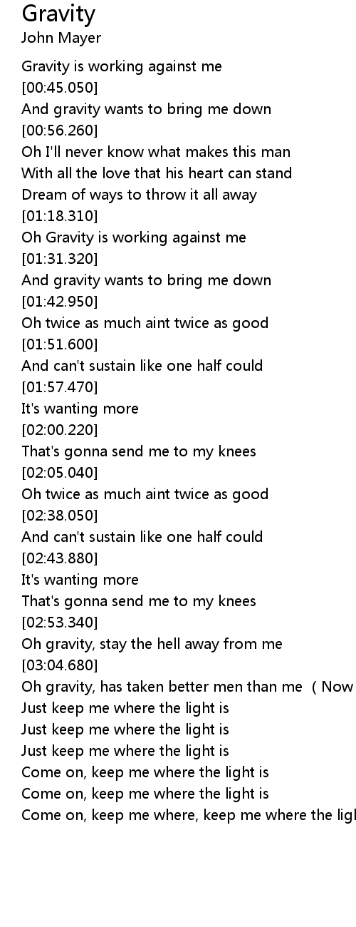 | [03:06.680] | Oh gravity, has taken better men than me Now how can that be? |