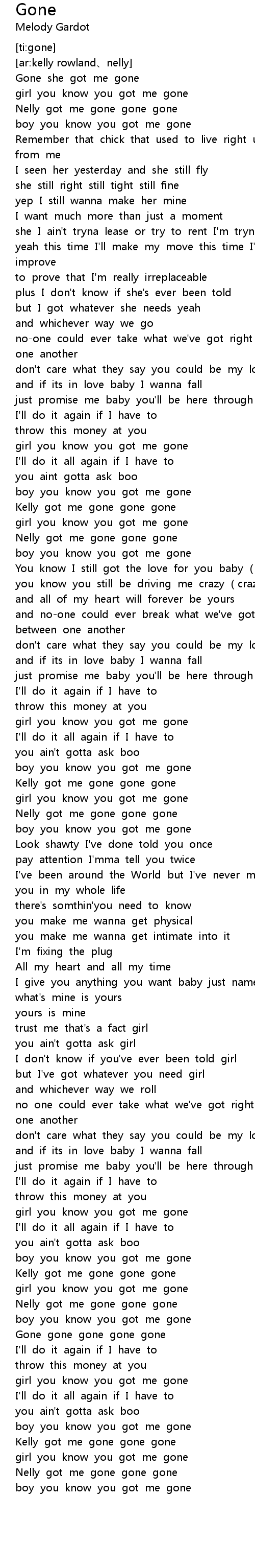 | [04:10.412] | Kelly got me gone gone gone |