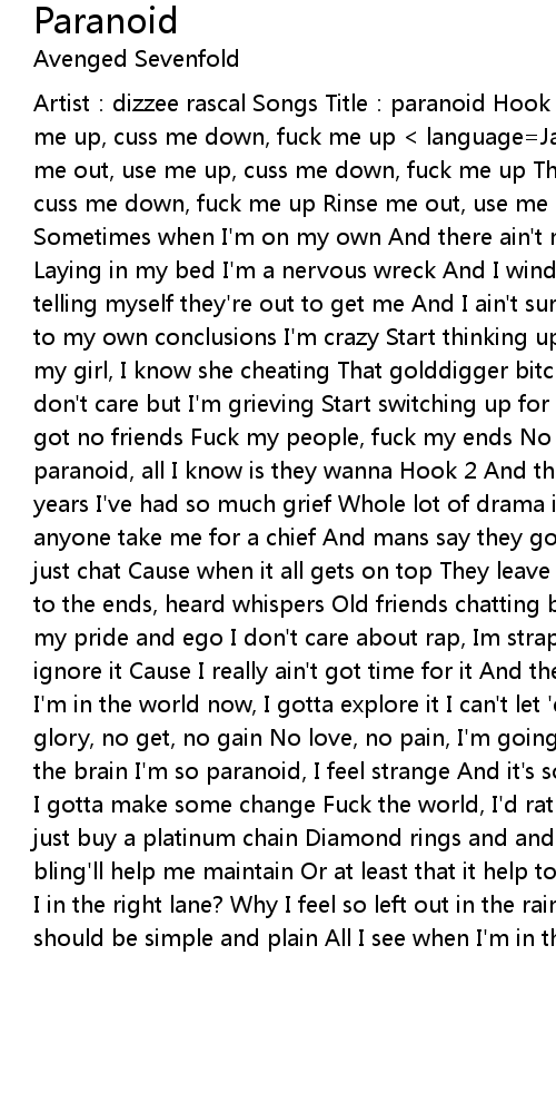 | [00:00.88] | Artist: dizzee rascal Songs Title: paranoid Hook Rinse me out, use me up, cuss me down, fuck me up language Java src' css ggg_left27. js' Rinse me out, use me up, cuss me down, fuck me up They wanna rinse me out, use me up, cuss me down, fuck me up Rinse me out, use me up, cuss me down, fuck me up 1 Sometimes when I' m on my own And there ain' t no one around I feel all alone Laying in my bed I' m a nervous wreck And I wind myself up until I' m vexed Keep telling myself they' re out to get me And I ain' t sure who, so I make it up Come to my own conclusions I' m crazy Start thinking up all kinds of stuff Like, fuck my girl, I know she cheating That golddigger bitch just thieving Act like I don' t care but I' m grieving Start switching up for no reason Told myself I ain' t got no friends Fuck my people, fuck my ends No rational thought, I' m low I' m paranoid, all I know is they wanna Hook 2 And then I think about beef Over the years I' ve had so much grief Whole lot of drama in and out of East Won' t let anyone take me for a chief And mans say they got my back But it' s really all just chat Cause when it all gets on top They leave me alone to scrap And I went to the ends, heard whispers Old friends chatting bout kidnapping Now they hurt my pride and ego I don' t care about rap, Im strapping But the olders told me ignore it Cause I really ain' t got time for it And the ghetto, I already saw it I' m in the world now, I gotta explore it I can' t let ' em Hook 3 No guts, no glory, no get, no gain No love, no pain, I' m going insane It' s all too much for the brain I' m so paranoid, I feel strange And it' s so longrange Been too long, I gotta make some change Fuck the world, I' d rather take some blame Or I could just buy a platinum chain Diamond rings and and other shiny things Maybe the bling' ll help me maintain Or at least that it help to explain What' s my path, am I in the right lane? Why I feel so left out in the rain? Why' s it hard, it should be simple and plain All I see when I' m in this game Everybody wanna Hook |