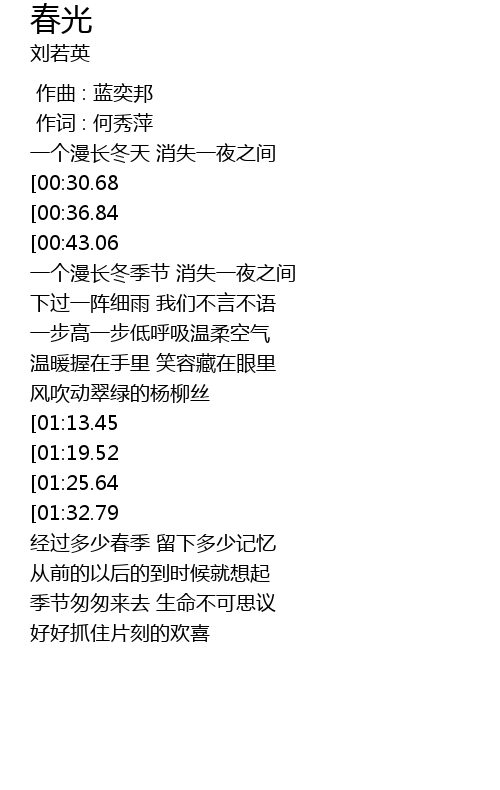 | [03:06.50][00:30.68] | 阳光里稍稍地浮动春天气息 |