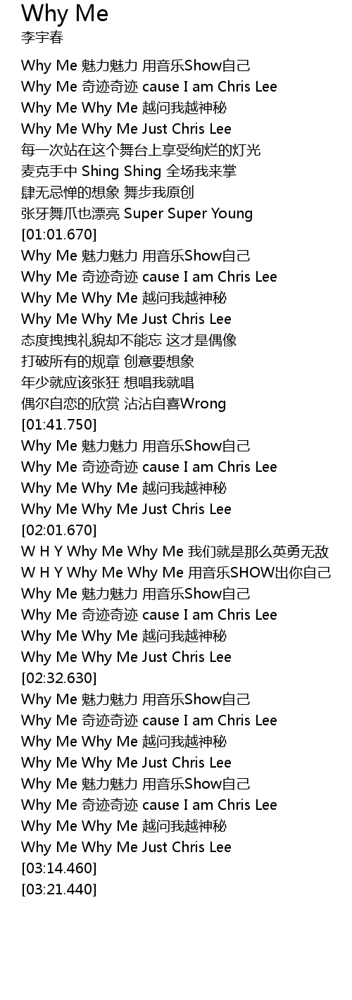 | [01:47.570] | Why Me 奇迹奇迹 cause I am Chris Lee |