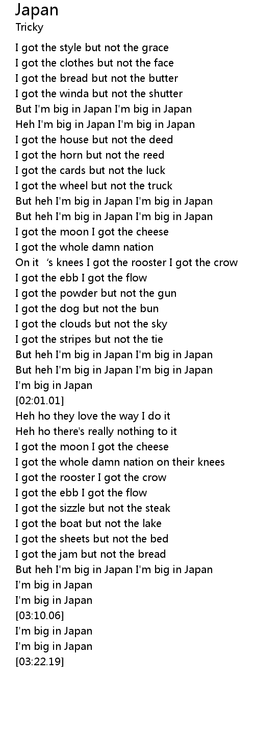 | [01:10.81] | But heh I'm big in Japan I'm big in Japan |
