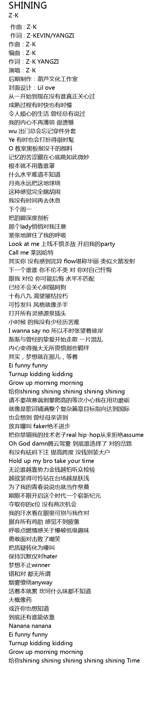 | [01:38.659] | gěi nǐ shining shining shining shining shining |