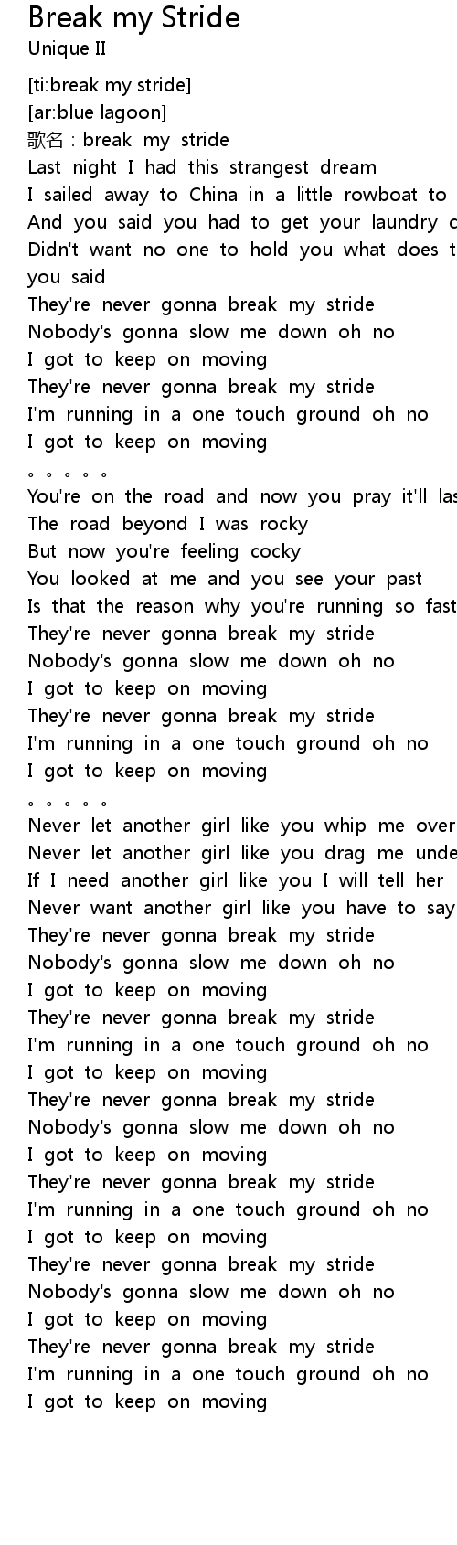 | [00:00.955] | gē míng: break my stride |